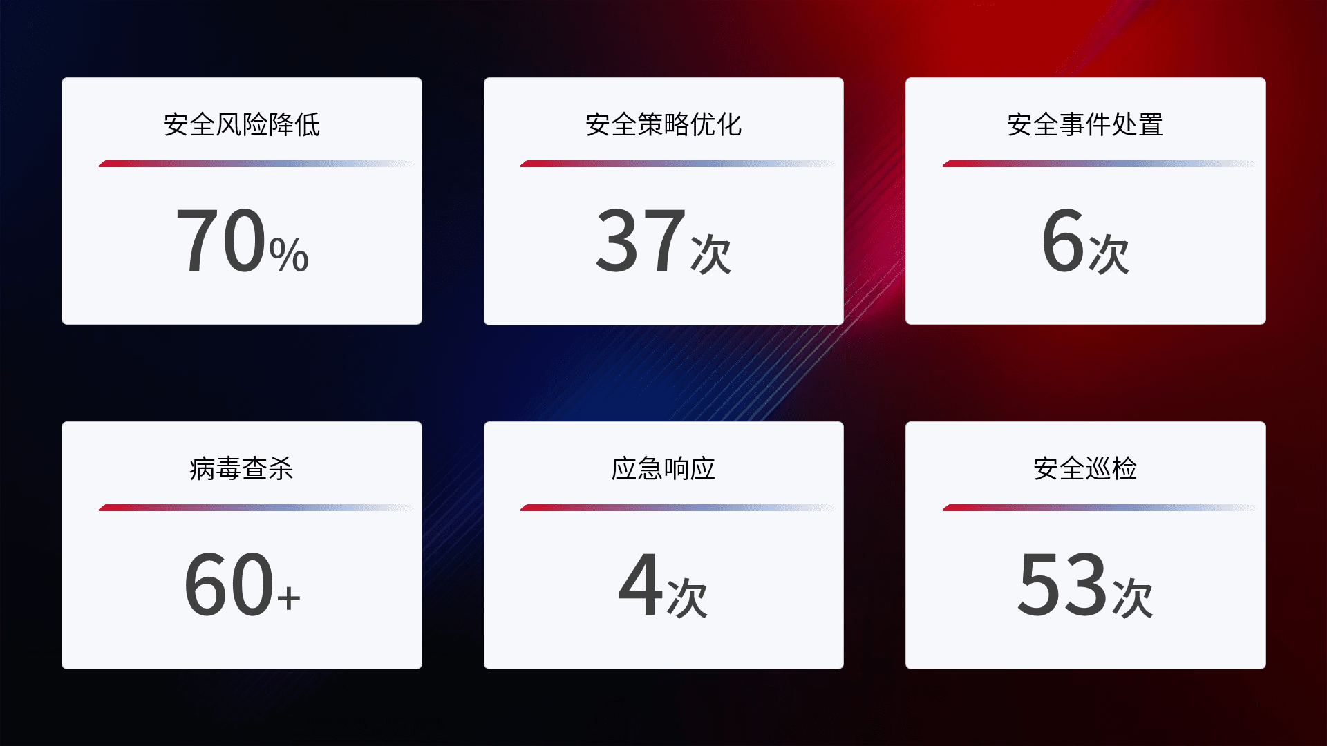 提供全面的安全事件报告体系,,包括处置报告、、周报、、、季度和年度总结,,,结合持续监控,,,,帮助客户深入了解网络安全状况。。。。